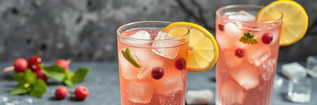 Refreshing summer drinks with lemon, mint, and berries on a grey background