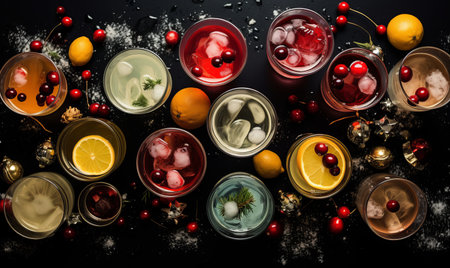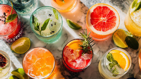 various cocktails in glassware on marble or wooden surface, top-down angle, garnished with citrus fruits and herbs
