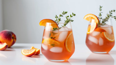 AI Generated. refreshing peach iced tea with fresh fruit slices and thyme
