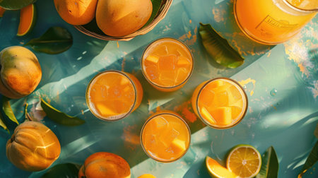 An aerial view of a round table featuring a pitcher of mango beer, glasses filled halfway, and a bowl of ripe mangoes, perfect for a summer gathering.
