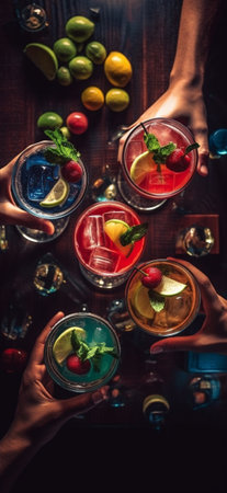 Generative AI : Happy friends drinking together at cocktail bar restaurant Group of young people enjoying night out toasting drinks on happy hour Top view