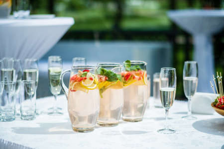A lot of glasses on the wedding table. Different drinks on the buffet table