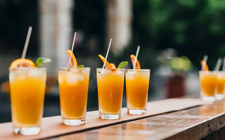 Cocktail glasses on outdoor bar tabr with orange drinks at shallow depth of field