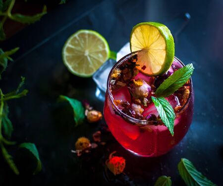 Close-up of homemade flower ice tea in a glass with fresh mint, on dark background