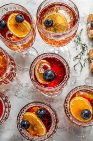 Overhead view of fruit cocktails featuring blueberries and citrus slices, perfect for summer drink recipes and entertaining ideas.