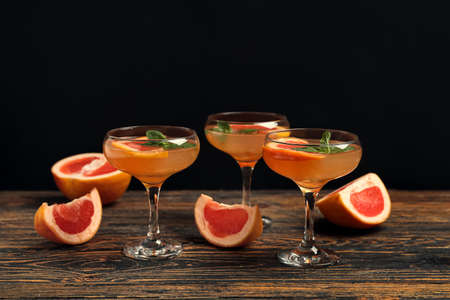 Cocktails with champagne in wine glasses on the bar table in the pub or restaurant.