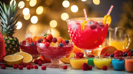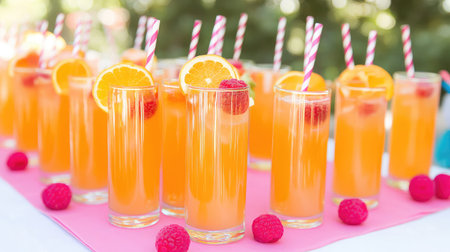 Sparkling party drinks in elegant glassware with floating fruits and striped straws on a summer-themed table