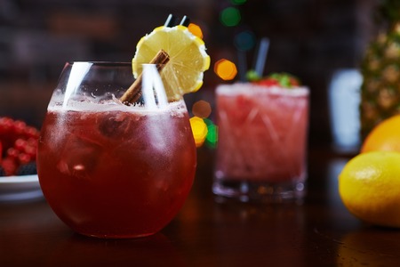 glass of delicious alcoholic cocktails or lemonade with ice, decoration of fresh berries and a slice of lemon on a wooden table in a bar or restaurant with a beautiful bokeh in the background
