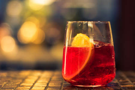 Set of alcoholic orange cocktails with pearl powder garnished with orange slices. Party at bar. Drinks for everyone. Nightbar. Night life.