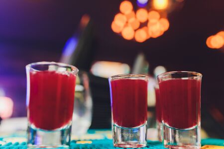 Bartender working, beautiful row line of different colored liquor alcohol cocktails on a party in a bar, and others on catering banquet on event, barman mixing drinks and beverages in a club