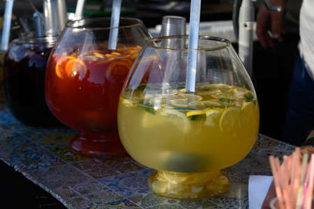 Different types of summer drinks in glasses, cubes of ice and slice of fruits on dark wiooden table. Healthy vitamin fruit and berry drinks.