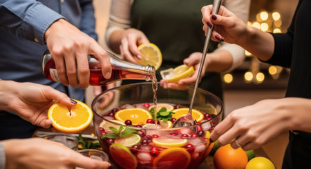 A group of people prepares a vibrant fruit punch in a large bowl, pouring a drink and adding fresh citrus slices, cranberries, and mint. This festive beverage is perfect for holiday gatherings and cel