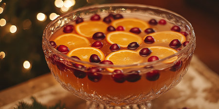 Crystal bowl filled with Christmas punch featuring cranberries and orange slices, creating a warm and festive atmosphere with bokeh lights in the background