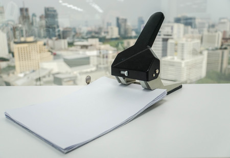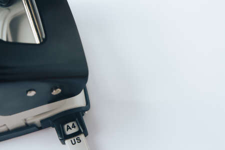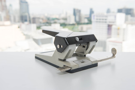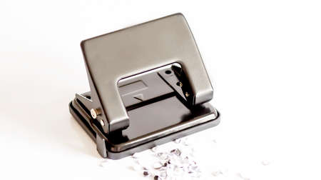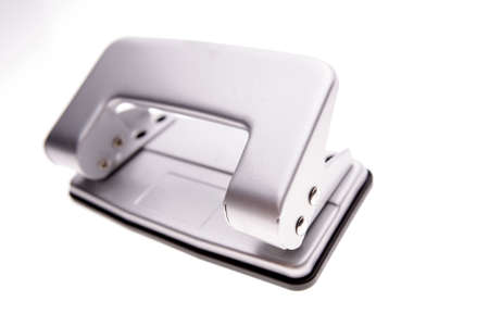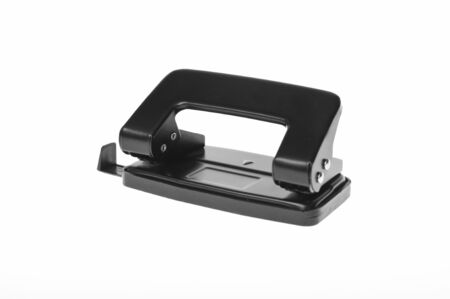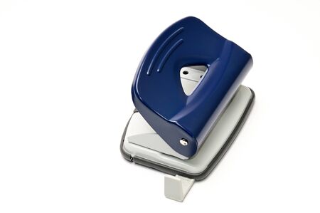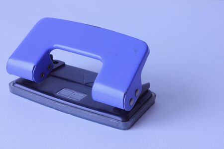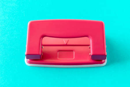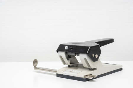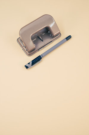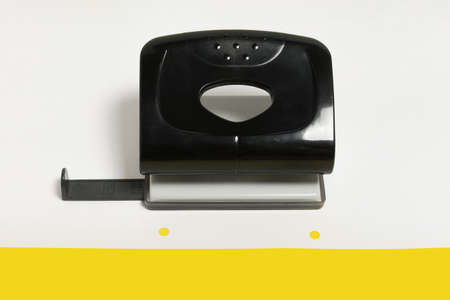 Office tools with a stapler and perforator still life against a seamless solid yellow background