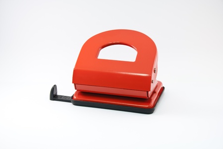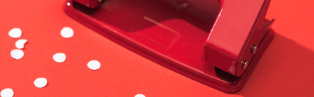 A closeup of a red and yellow hole puncher on the table with a blurry background