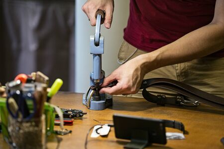 Master is working on press with skin. Creating a belt made of genuine leather. On brown wooden table scattered with tools and accessories. Handmade concept. Horizontally framed shot.