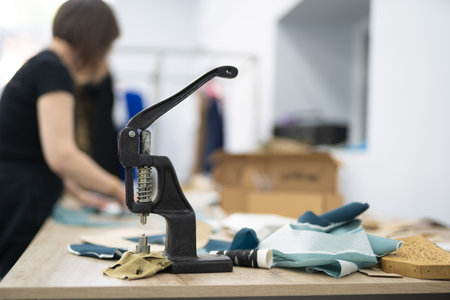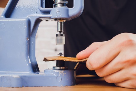 Artisan using hand press for setting snaps in leather for makes a wallet. Hand Pressure Snap Pressing Machine is using by craftsman in leather workshop.