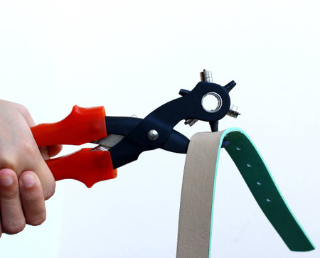 The process of manufacturing a leather belt by tanner. Puncture holes in the strap using a punch. Belt Hole Puncher Power Assist Heavy Duty Revolving Eyelet Punch Plier. Closeup