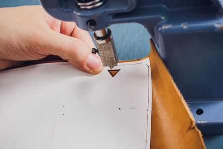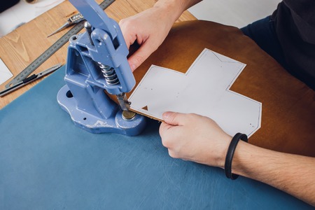 Craftsman is using leather punching press for creating forms from genuine leather. Process of creating genuine leather products in factory