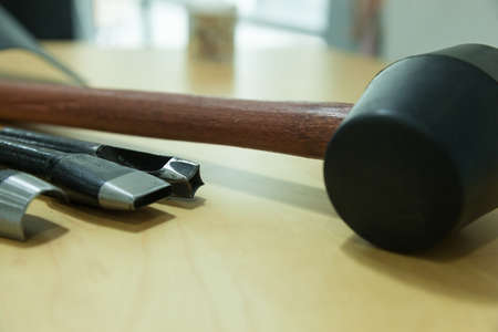 Rubber hammer and chisel Placed on a wooden table What types of Different patterns of use.