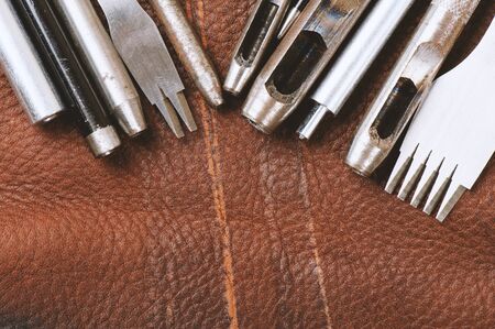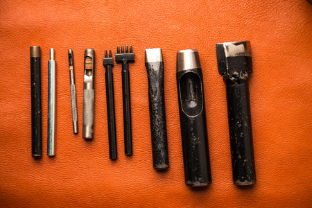 Leather craft hole puncher and leather on the tanner workbench concept background.