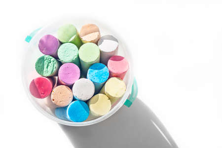 Pack of Jumbo Sidewalk Chalk, Assorted Colors in a Plastic Bucket on White Background with Shadow. Top View.