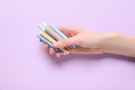 Woman holding many colorful chalks on purple background