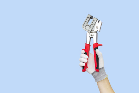 Gloved hands holding metal profile connector construction tools. Work tools on blue background