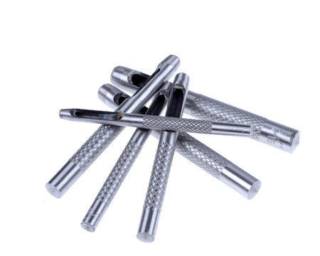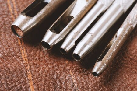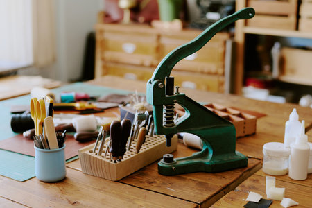 Medium close up of old metal leather punch machine surrounded by different types of punch tools and tailor accessories