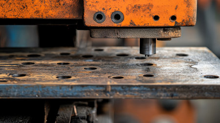 An industrial drill sits in a factory work area, surrounded by oil stains and machinery components, showcasing the essence of industrial production and craftsmanship.