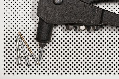 Detail of an old rivet gun (hand riveter) with rivets on a white background with holes