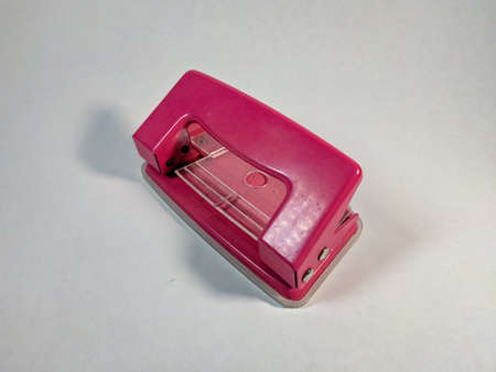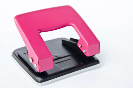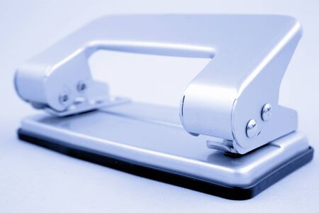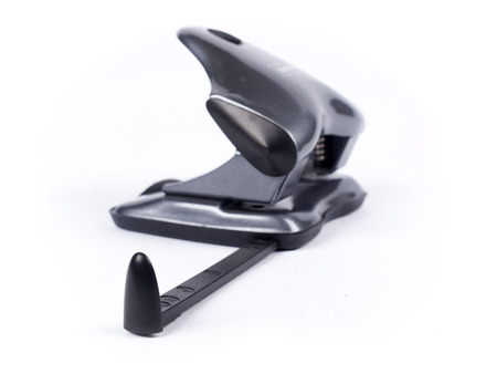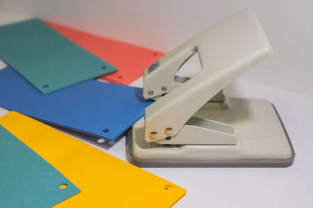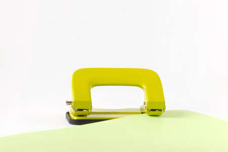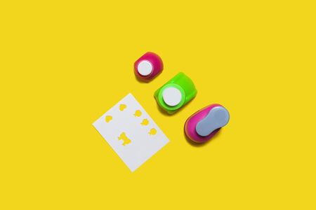 A row of small plastic hole punchers near sheet of paper standing on the yellow