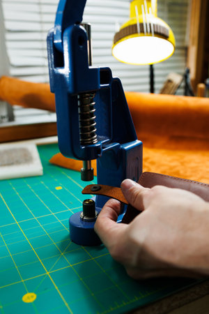 Artisan using hand press for setting snaps in leather for makes a wallet. Hand Pressure Snap Pressing Machine is using by craftsman in leather workshop.
