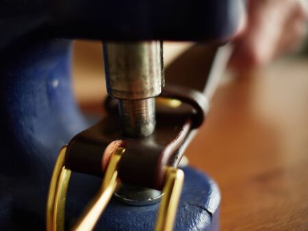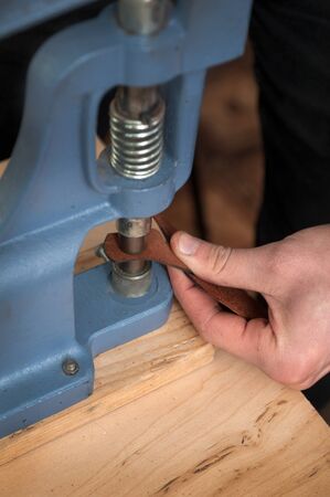 Close up, the master comes out of the leather at press machine, tool and leather fittings.