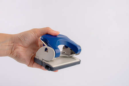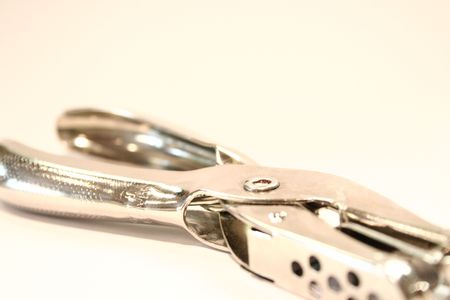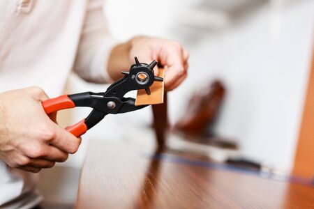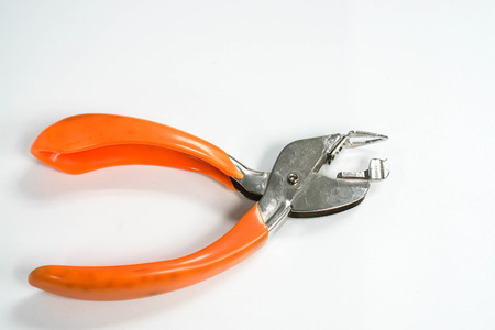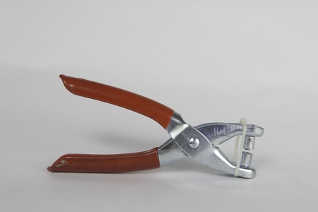 Puncture holes in the strap using a punch isolated on white background. Belt Hole Puncher Power Assist Heavy Duty Revolving Eyelet Punch Plier. close up