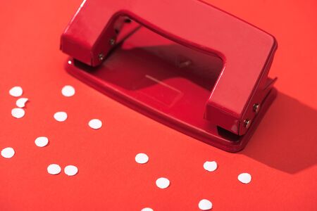 A red hole punch and a red stapler on a green background. Minimal stationery concept.