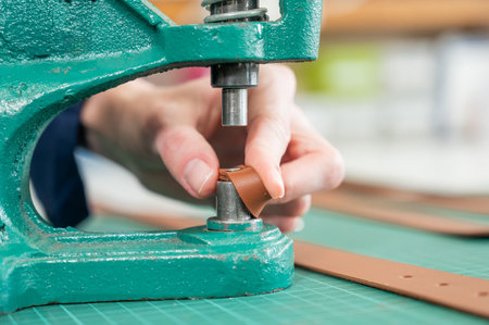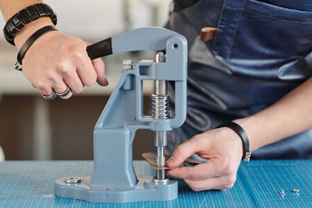 Close-up of unrecognizable artisan in apron using hand press for setting snaps in leather
