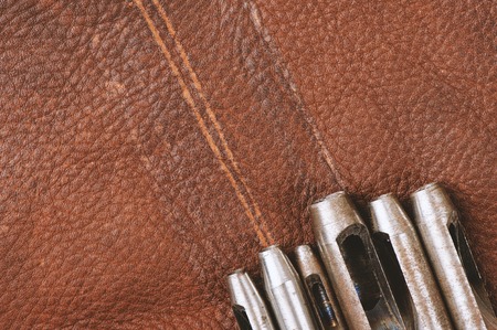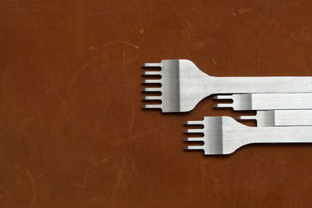 Leather Craft Pricking Iron Diamond Stitching Chisel Hole Punch Tool on Tan Color Genuine Leather Background.