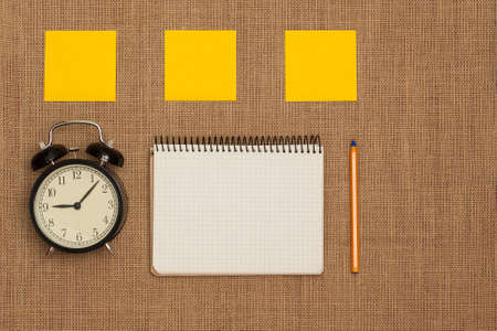Blank notebook, pen, watch and paper for notes. The concept of planning, time management, deadline, rush job, exam, etc.