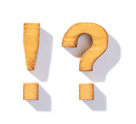 Brown wooden symbols of exclamation and question marks with 45 degree long shadow as a real life flat design font elements, isolated over the white background