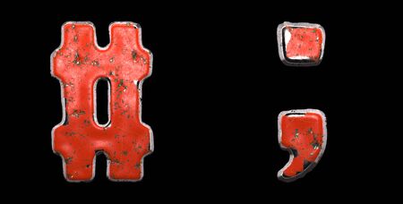 Set of symbols hash, semi-colon made of red painted metal isolated on black background. 3d rendering
