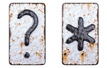 Set of symbols question mark and asterisk made of forged metal on the background fragment of a metal surface with cracked rust. 3d rendering