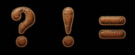 Set of symbols question mark, exclamation mark, equals made of leather. 3D render font with skin texture isolated on black background. 3d rendering