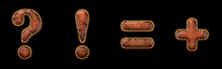 Set of symbols question mark, exclamation mark, equals, plus made of leather. 3D render font with skin texture isolated on black background. 3d rendering