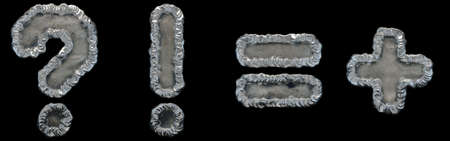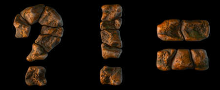 Set of rocky symbols question mark, exclamation mark, equals. Font of stone on black background. 3d rendering