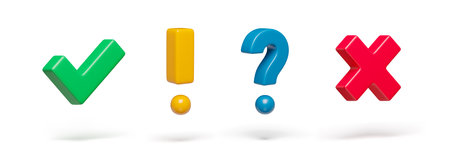 Right, wrong and exclamation, question check marks on white set. Acceptance, rejection, interrogation and attention signs three-dimensional rendering vector illustration
