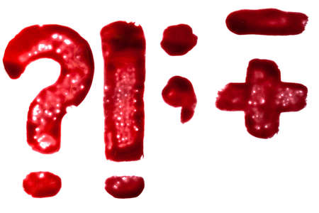 Painted in bloody paint symbol sign of question mark, exclamation mark set isolated on white background.
