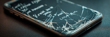 A cracked phone screen shows emotional messages written in handwriting, resting on a tidy surface, conveying feelings of love and longing.