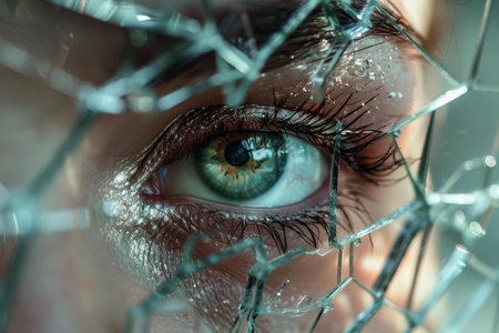 Detailed view of an eye seen through shattered glass, conveying a sense of fragility and vulnerability