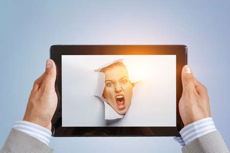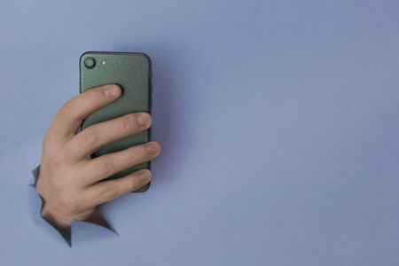 Men's hands holds smartphone through a hole in torn blue paper wall. Horizontal picture with copy space and selective focus